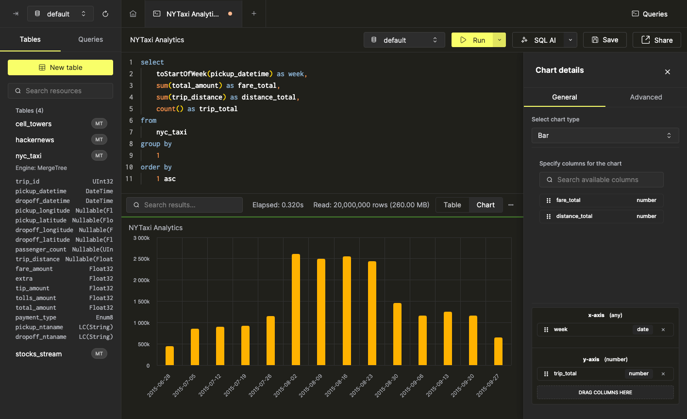 Some data can be more easily interpreted in chart form. You can quickly create visualizations from query result data directly from the SQL console in just a few clicks. As an example, we’ll use a query that calculates weekly statistics for NYC taxi trips:
